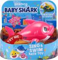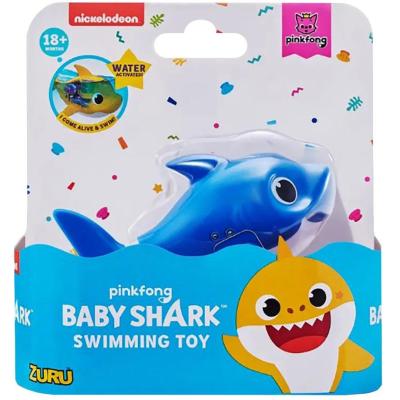 This recall involves both full-size Robo Alive Junior Baby Shark Sing & Swim bath toys and Mini Baby Shark Swimming bath toys. The recalled full-size Baby Shark bath toys sing and swim when placed in water. They have a hard plastic top fin with three grooves on one side, measure about 7-inches from nose to tail and were sold in three colors: yellow, pink and blue. They were sold individually and in packs of three. The recalled full-size bath toys have tracking label information on the bottom, including raised lettering that states model number “#25282” and a date code beginning with the letters “DG” followed by “YYYY/MM/DD” in the date range DG20190501 through DG20220619. Only full-size Baby Shark toys with a hard plastic top fin are included in this recall.