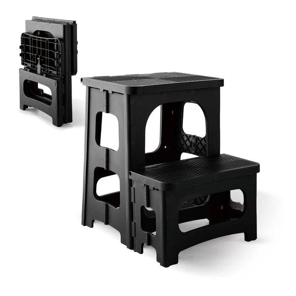 The step stools are made of black or white plastic and measure about 17 inches tall, 15-1/2 inches wide, and 13 inches deep. The first step is about 8 inches high, and the top step is about 17 inches high. The step stools were sold exclusively on Amazon.com from November 2021 through July 2023 for between $24 and $62.