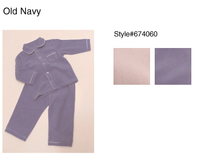 Style 674060 are two-piece, front button top with long sleeve, long pants. The sets come in lavender or blue with white piping around the pant cuff with a shirt that has piping around the collar, front placket and cuff. The pajamas are labeled "Old Navy," and 100% polyester." They were sold in infant size 6-12 months through toddler size 2T-3T.